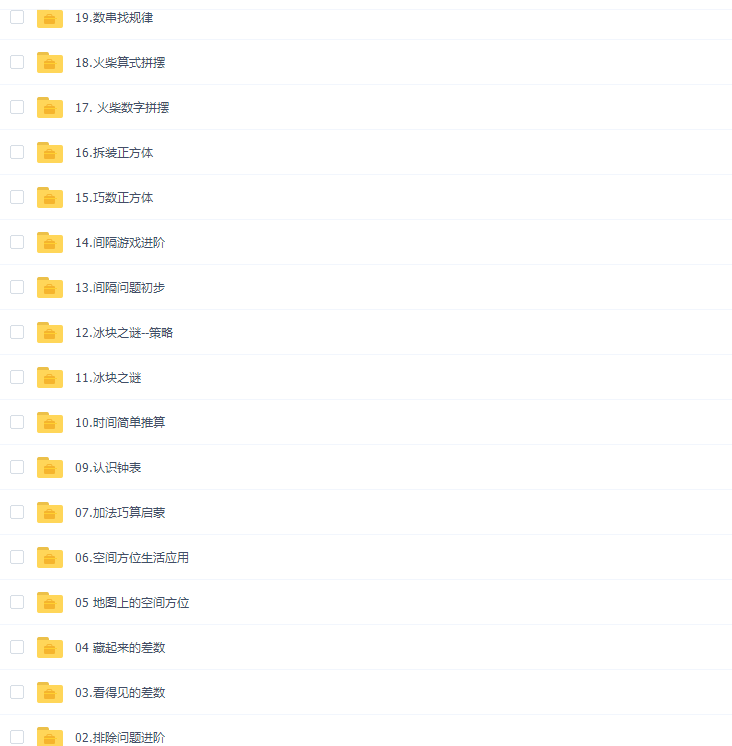 此课件来自学而思网校,2020秋季杨彬大班数学思维目标S班(高清视频)。此课件主要知识点包括:排队问题初步、排队问题进阶、差数、空间方位、加法巧算、减法巧算、认识钟表、时间简单推算、间隔问题初步、间隔游戏进阶、巧数正方体等等视频课程。。。