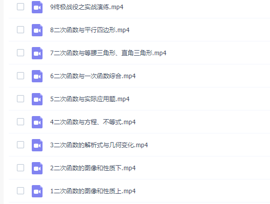 此课件来自猿辅导网校,初三数学王博初三二次函数9节课课程。此课件主要知识点包括:二次函数的图像和性质、二次函数的解析式与几何变化、二次函数与方程、不等式、二次函数与实际应用题、二次函数与一次函数综合、二次函数与等腰三角形、直角三角形、二次函数与平行四边形、终极战役之实战演练。