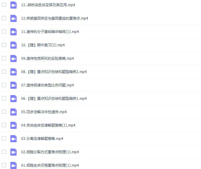 此课件来自作业帮网校,苏萧伊高三生物2021年秋季尖端班课程。此课件主要知识点包括:细胞生命历程重难点梳理、细胞分裂方式重难点梳理、分离定律解题策略、自由组合定律解题策略、四步法解决伴性遗传、遗传规律非典型比例问题、遗传物质探究的实验策略、遗传的分子基础精讲精练、突破基因突变与基因重组的重难点、辨析染色体变异及其应用、现代生物进化理论重难点剖析、种群与群落知识点梳理、解决生态系统结构与功能重难点。